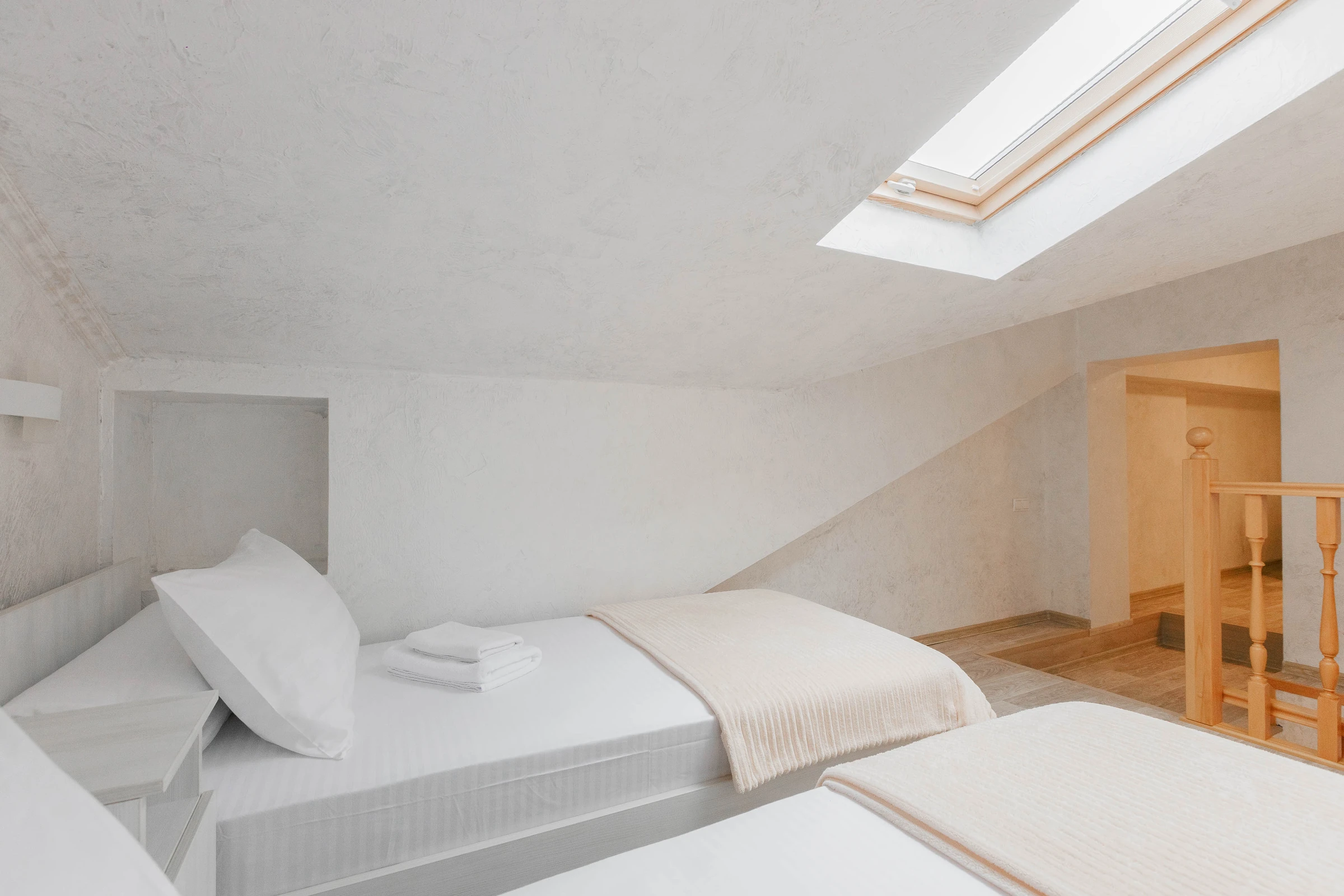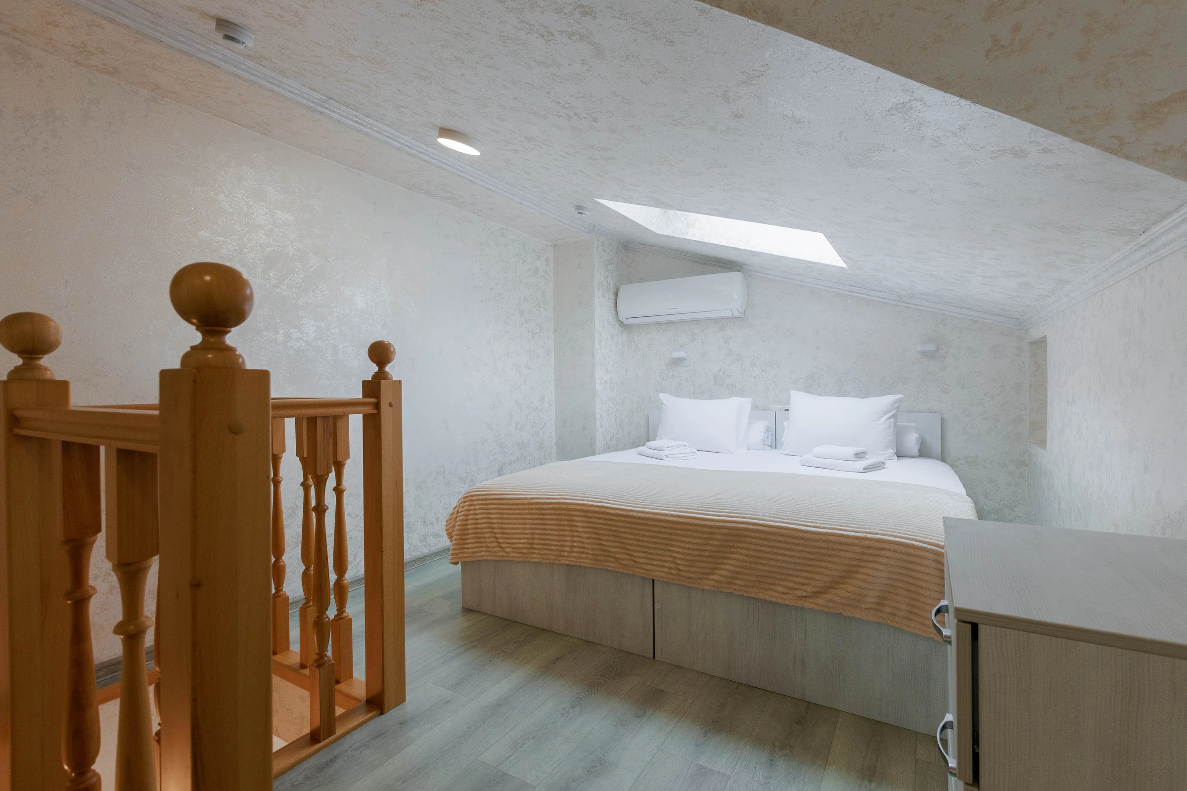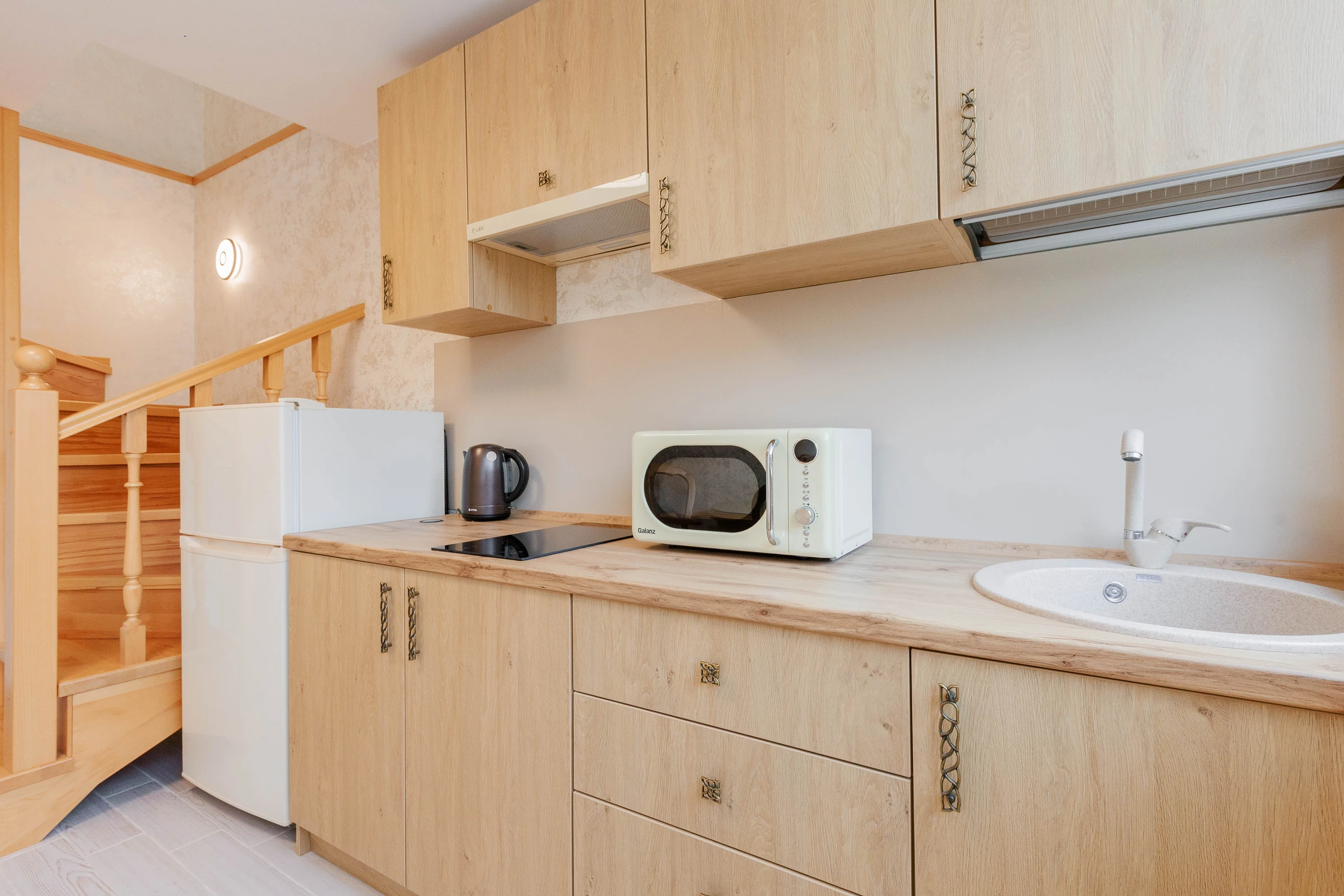 В номерах данной категории предусмотрено два этажа, объединенные внутренней лестницей, что обеспечивают функциональное разделение пространства: кухня, гостиная находится внизу, спальная зона наверху.Собственная кухня