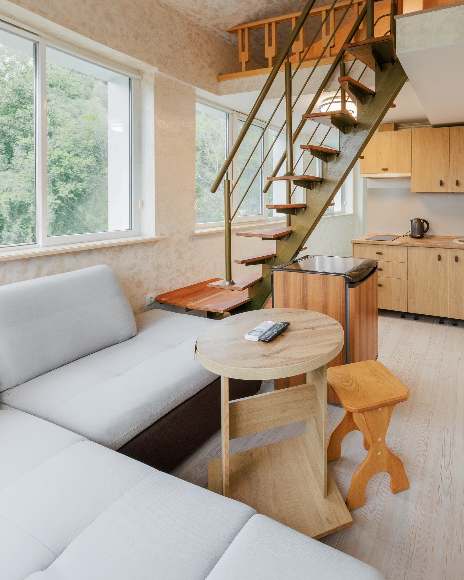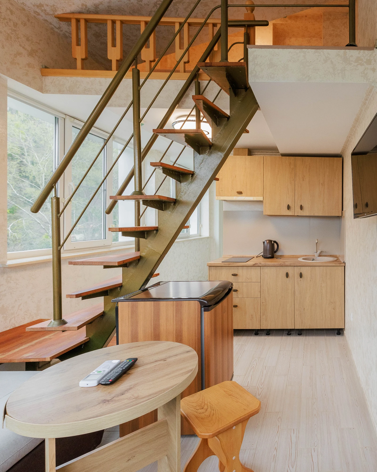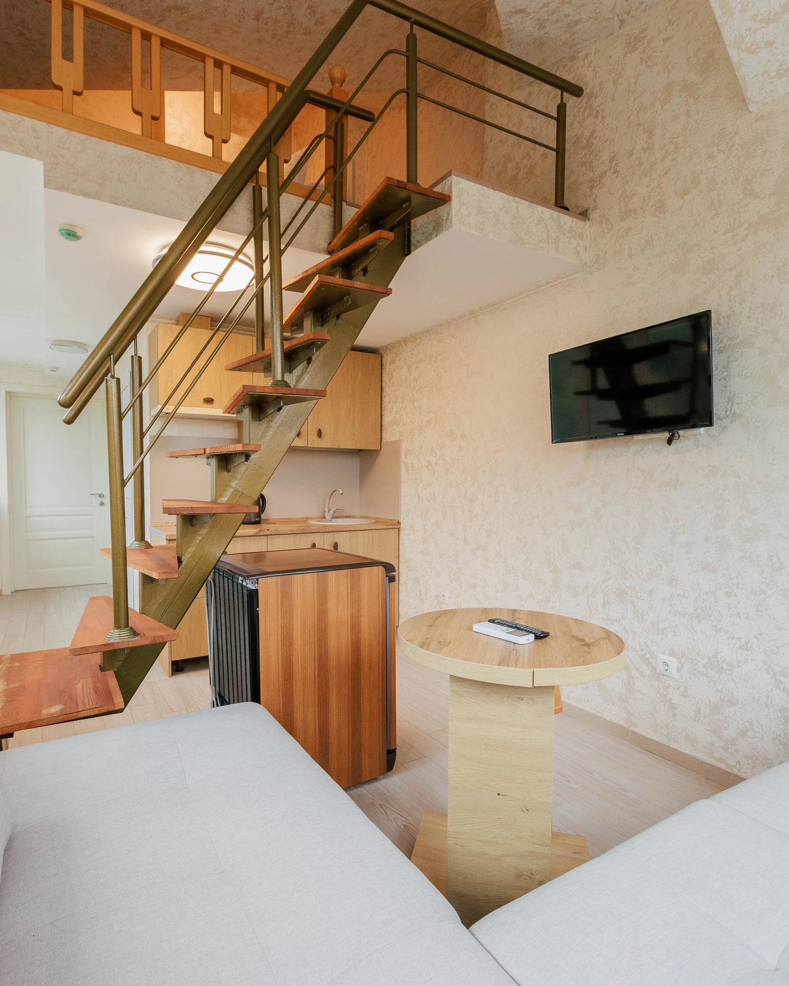 В номерах данной категории предусмотрено два этажа, объединенные внутренней лестницей, что обеспечивают функциональное разделение пространства: кухня, гостиная находится внизу, спальная зона наверху.Собственная кухня